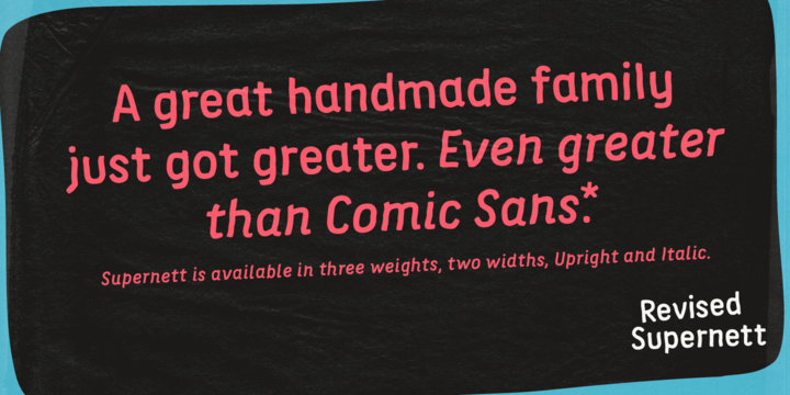 Supernett is an organic and decorative hand-drawn / handmade Sans Serif display-family for packaging, posters, book-covers, kids- (children-), food- and logo-design and will best stand out in huge grades. Its handmade / hand-drawn origin is subtle yet visible.